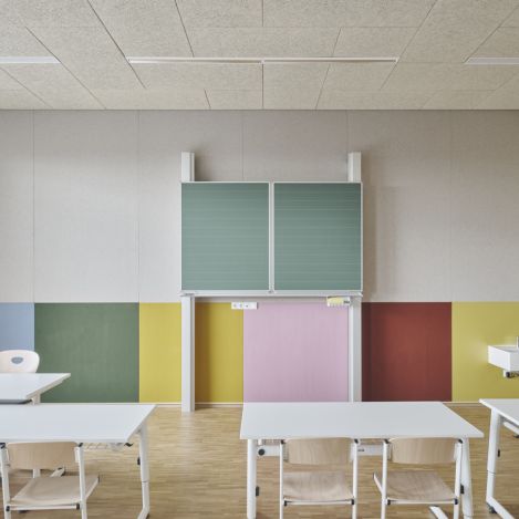 Wer das Gebäude betritt, spürt sofort die atmosphärische Wirkung der Räume. Die Eingangshalle öffnet sich zur zweigeschoßigen Zentralgarderobe, von der aus der Blick bis ans hintere Ende des Hauses reicht. Transparenz, Tageslicht und Übersicht – alles keine Selbstverständlichkeit in einem öffentlichen Bildungsbau. Diese Leichtigkeit zieht sich wie ein roter Faden durch das Gebäude. An die Garderobe schließen sich Aula und Speisesaal an, nur getrennt durch einen mobilen Vorhang. So kann der Raum bei Bedarf zur Veranstaltungsfläche mit Bühnencharakter werden – flexibel, offen, nutzungsneutral. Auch der Turnsaal, vollverglast mit Blick ins Grüne und Oberlicht, ist in diesen Raumverbund eingebettet. So kann sich ein Gefühl von Weite entwickeln, von Schule als einem Ort, der Bewegung zulässt, nicht begrenzt. Eine wunderbare Basis für wissensdurstige Hirne, oder? Apropos Hirne und Lernen: Zentrum des pädagogischen Konzepts sind die fünf Cluster, jeweils mit vier Klassen, Freiräumen und Zusatzräumen. Jeder Cluster hat einen eigenen Zugang zur Terrasse, Tageslicht auf allen Seiten und eine eigene Farbwelt. Im Inneren öffnen sich sogenannte Lernlandschaften: offene, wohnlich gestaltete Zonen mit Nischen, Podesten, Vorhängen – zwischen Wohnzimmer, Werkstatt und Rückzugsort. Die Möblierung ist verspielt, die Materialien sind warm: Lehmputz an den Wänden, Filzpaneele als Pinnflächen, Tischler-Einbaumöbel, Spieltürme, Sitzstufen. Kein Einheitsbrei, sondern differenzierte Räume, die Individualität und Gruppendynamik zulassen. „Bei dieser Schule steckt wahnsinnig viel Liebe im Detail“, erzählt Projektleiter Martino Libisch. Und tatsächlich: Kaum eine Fläche, kaum eine Wand scheint zufällig. Alles wurde durchdacht, getestet, angepasst – mit einem Ziel: die Schule zum gemeinsamen Lebensraum zu machen.